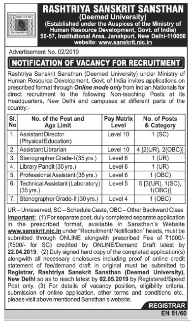 Interested candidates can apply to the post through the online mode on or before 22 April 2019. After submitting the online application, the candidates are required to submit the hard copy of the application to the Registrar, Rashtriya Sanskrit Sansthan (Deemed University), New Delhi on or before 2 May 2019.