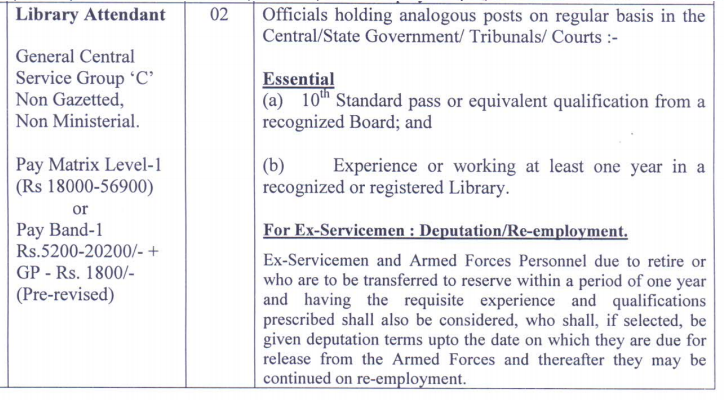 Persons holding analogous posts in any Central or State Governments or High Courts and District Courts thereto or in lower posts with atleast ten years regular service in the Level-4 of the pay matrix (Rs 25500-81100) or equivalent and possessing educational qualifications and experience as under :-